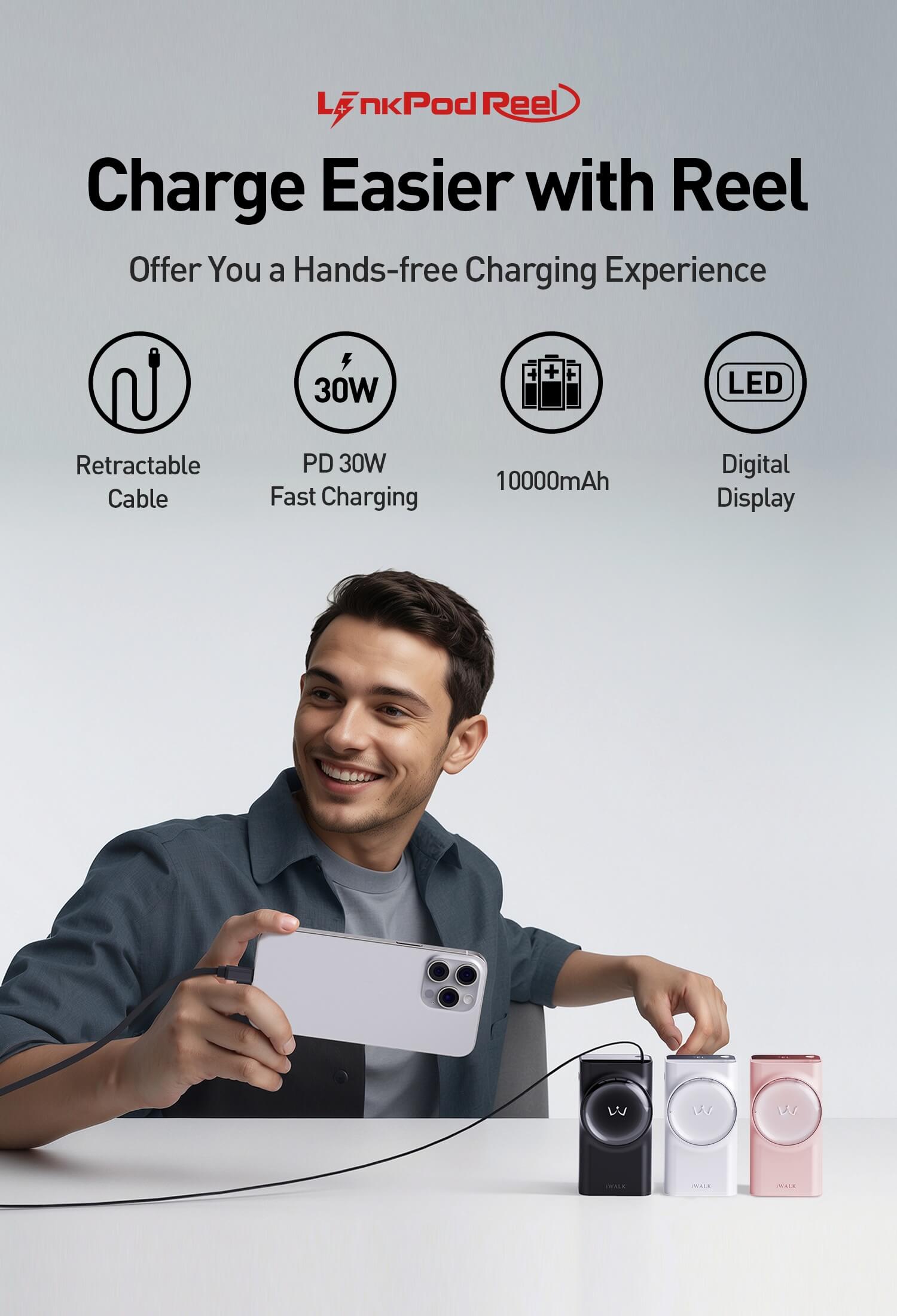 iWALK LinkPod Reel 10000|30W Built-in 2.3ft Cable Portable Charger