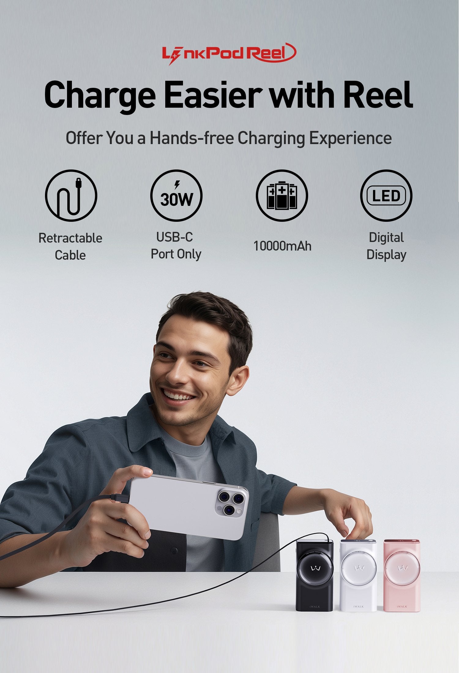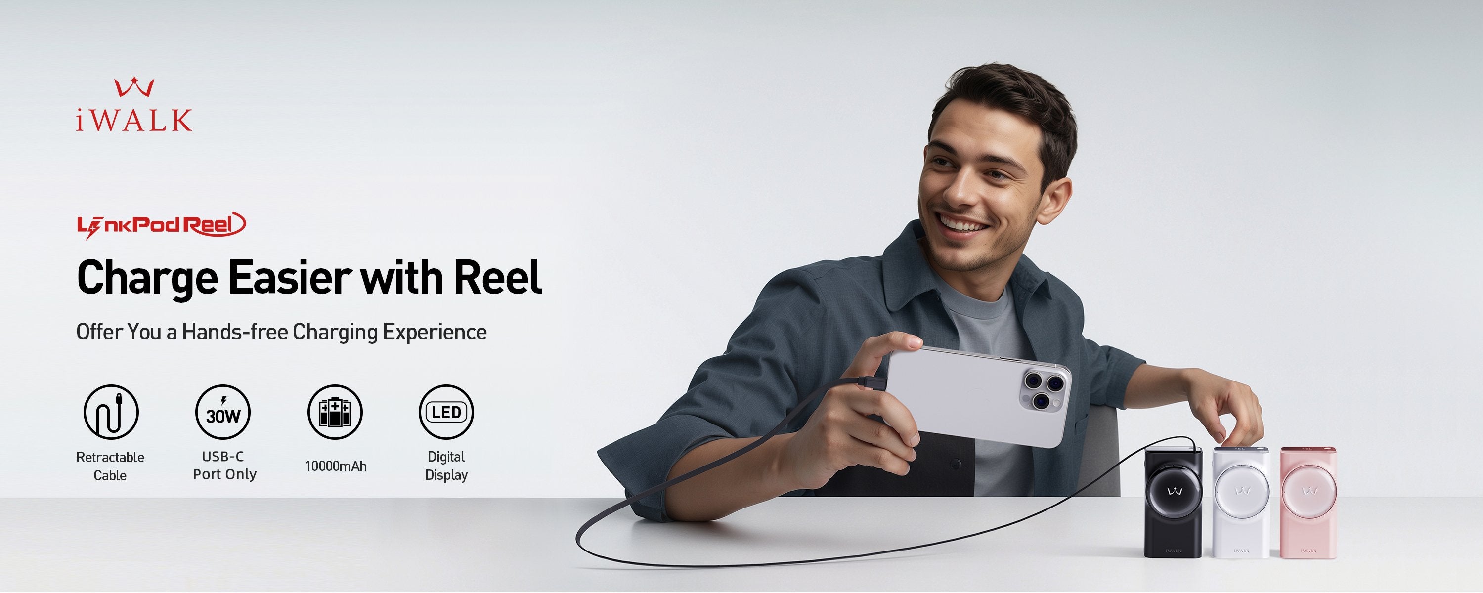 iWALK LinkPodReel Slim | 30W, Retractable 1.97ft Cable Power Bank